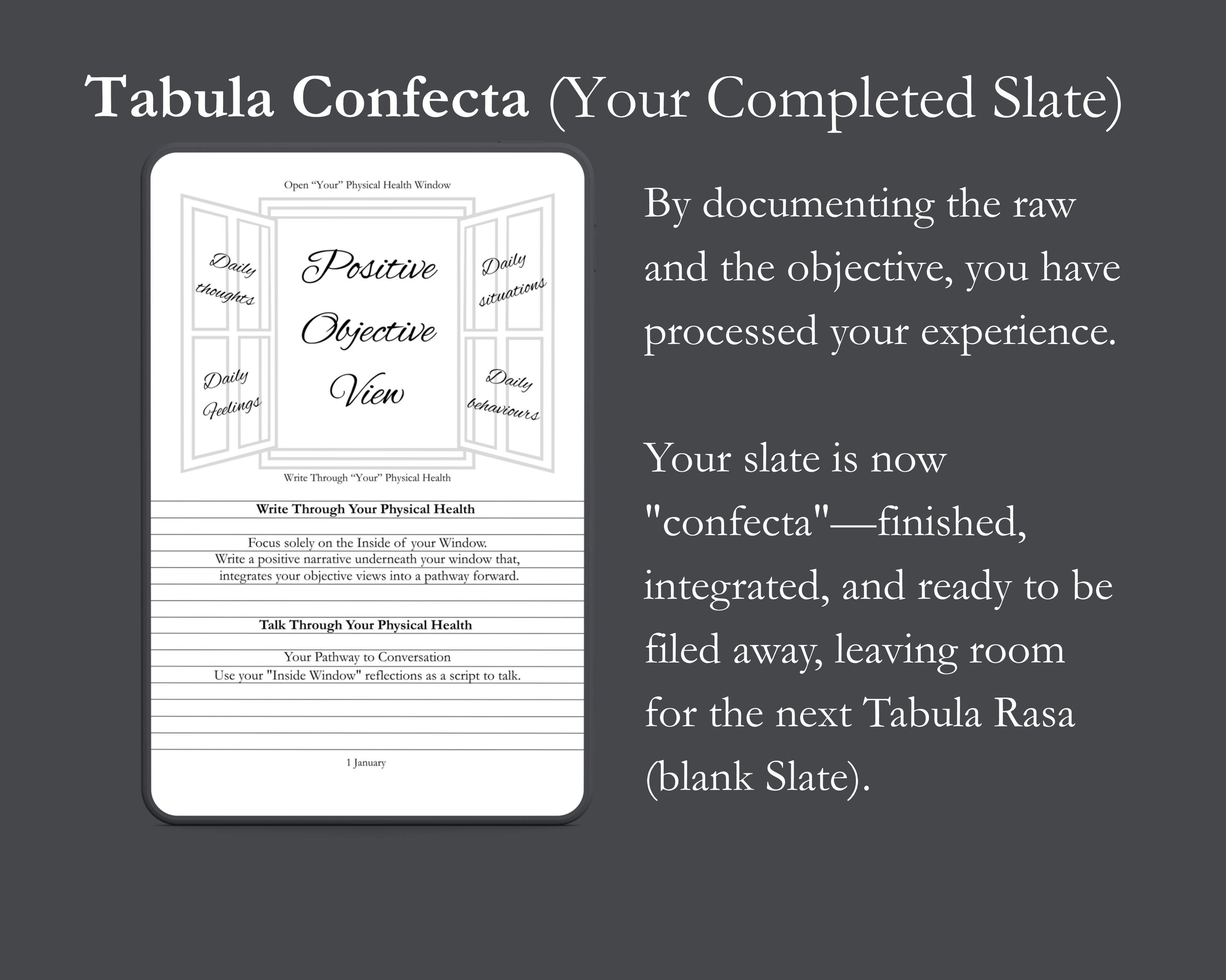 Review your entries. By documenting the raw and the objective, you have processed your experience. The slate is now "confecta"—finished, integrated, and ready to be filed away, leaving room for the next Tabula Rasa.