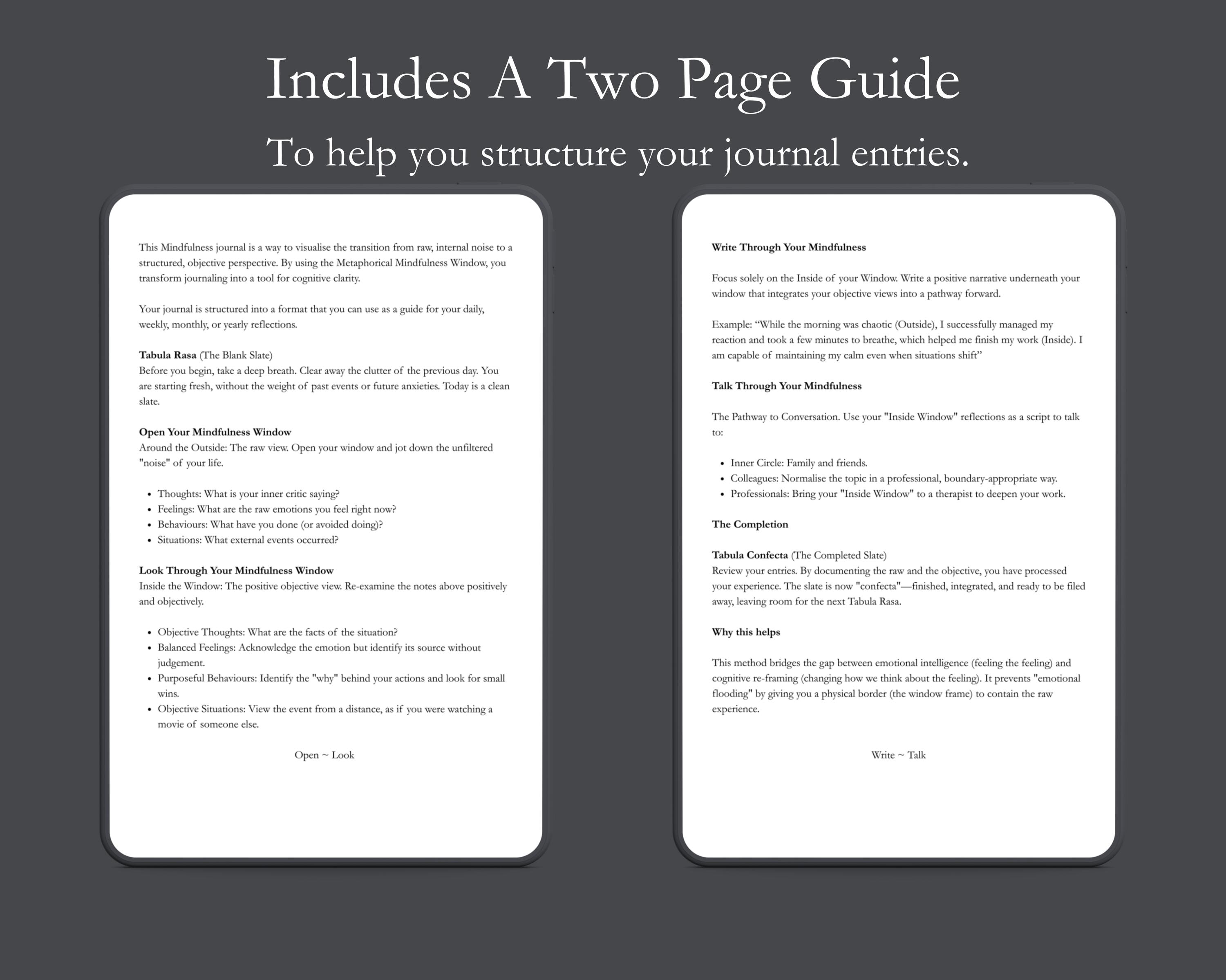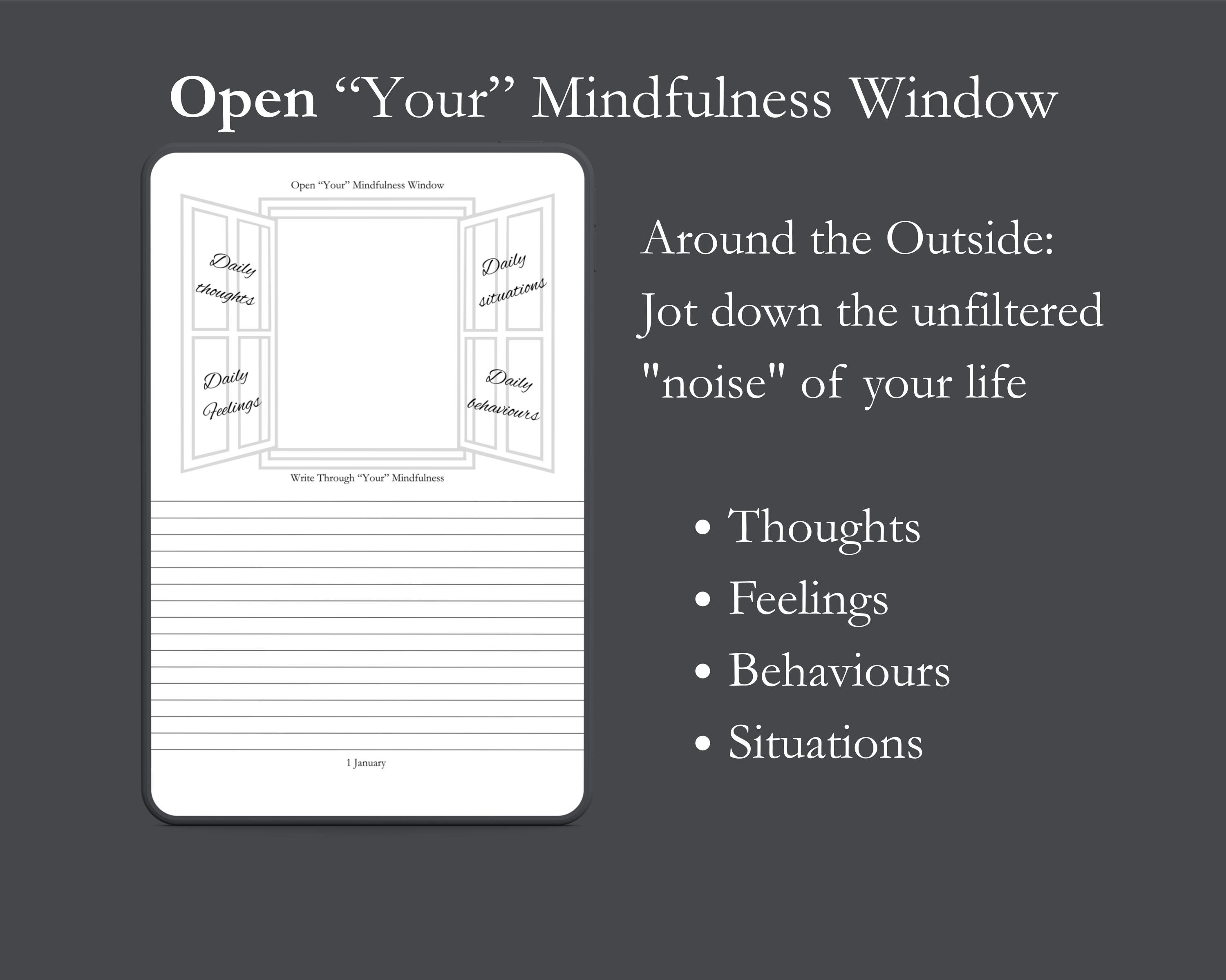 This Mindfulness journal is a way to visualise the transition from raw, internal noise to a structured, objective perspective. By using the Metaphorical Mindfulness Window, you transform journaling into a tool for cognitive clarity.